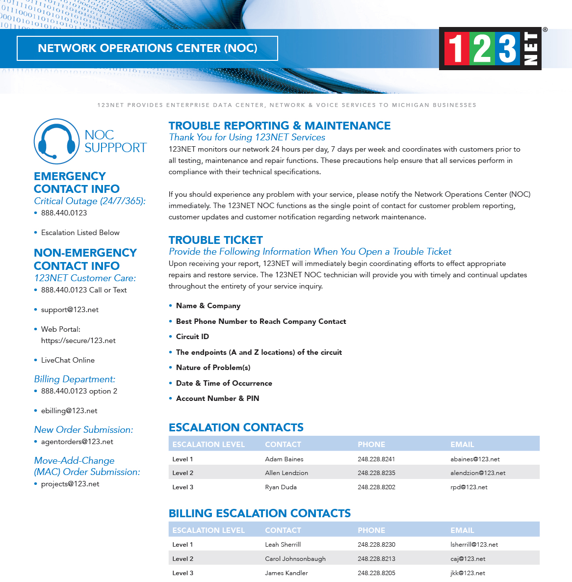 At 123Net, Superior Customer Service Is The Number One Priority. 123Net’s dedicated support team is on site and available 24 hours a day, 365 days a year. In order to expedite customer service, there are a few things that will be helpful to have available when contacting the support team.
